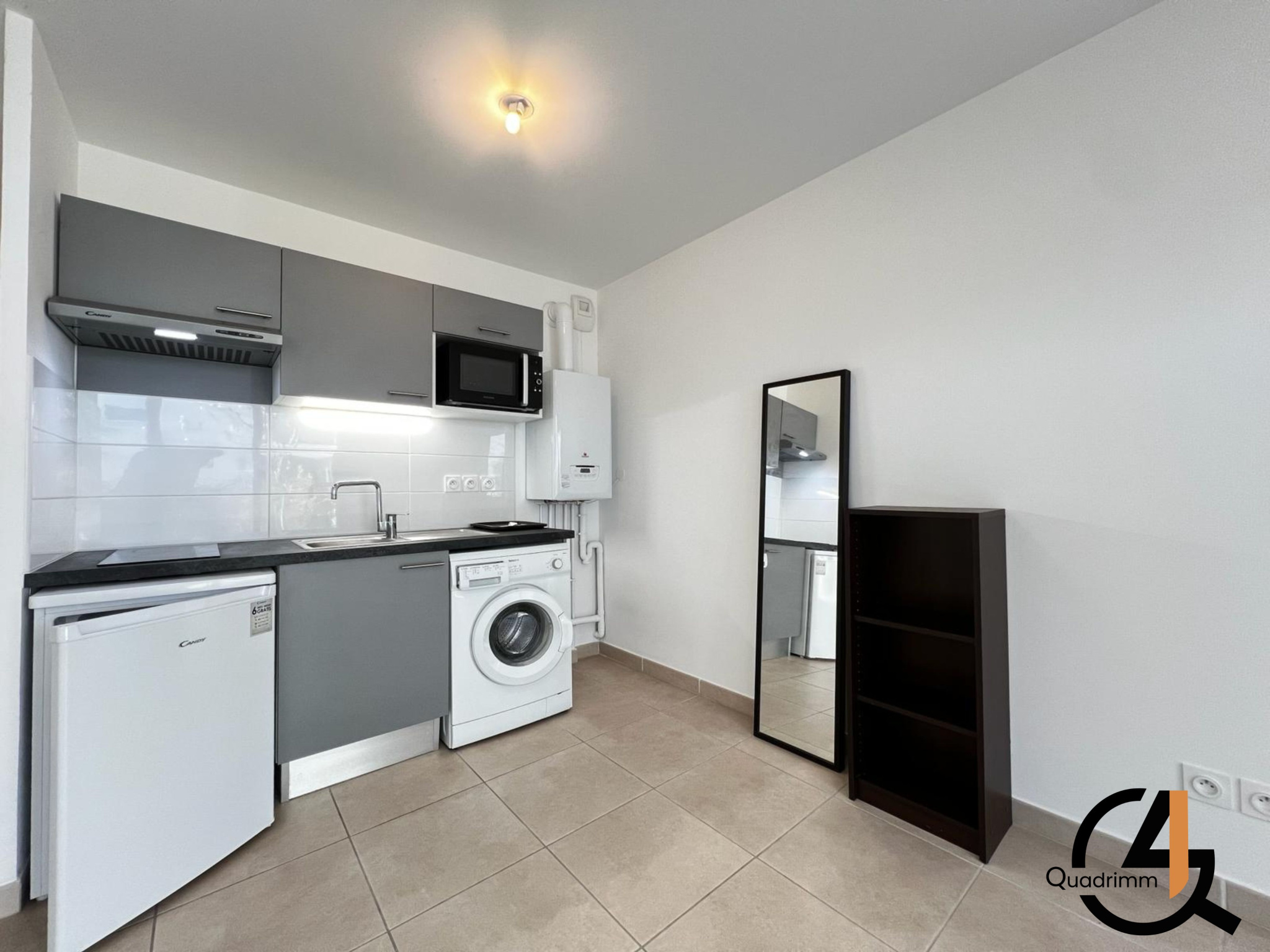Ce logement offre une grande pièce de vie baignée de lumière, comprenant un coin cuisine équipée et donnant accès à une terrasse ensoleillée. De plus, il est pourvu d'une spacieuse salle d'eau moderne avec W.C.