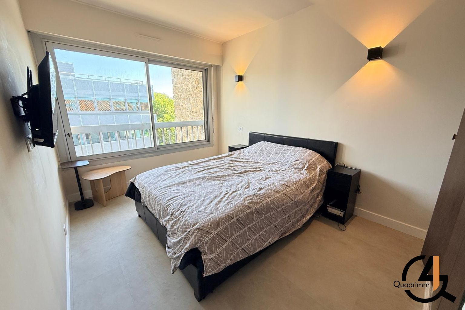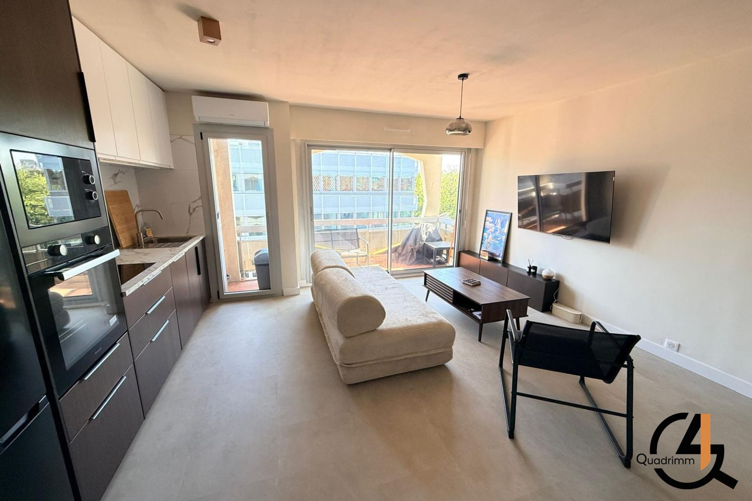 Le logement se compose d’un salon/séjour avec cuisine entièrement équipée, ouvrant sur un balcon de 4,40 m², d’une chambre de 10 m² avec accès à une salle d’eau, ainsi que d’un WC séparé.